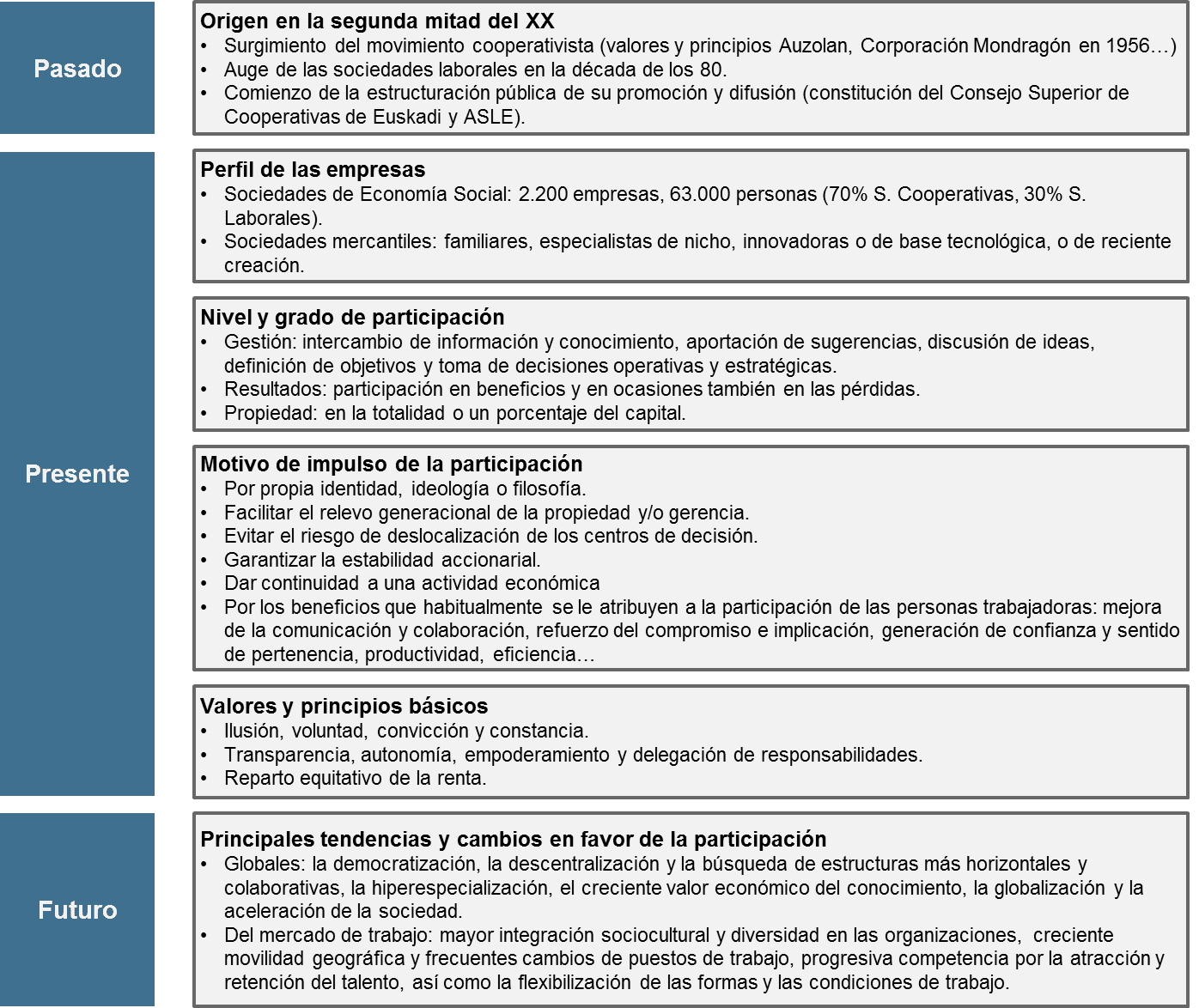 La participación en propiedad tiene su origen en el siglo XVIII, con el nacimiento del cooperativismo vinculado al proceso de transformación económico, social y tecnológico que se inició en la segunda mitad de ese siglo en Reino Unido, aunque en nuestro entorno comenzó a cobrar mayor relevancia varios siglos después, en la segunda mitad del XX; hablamos del surgimiento del movimiento cooperativista en Euskadi (valores y principios Auzolan, Corporación Mondragón en 1956…) y comenzó la estructuración pública de su promoción y difusión, con la constitución por ejemplo del Consejo Superior de Cooperativas de Euskadi en 1983. Posteriormente, en la década de los 80, se produjo el auge de otra de las estructuras organizativas por excelencia en el impulso de la participación en nuestro territorio, las sociedades laborales, y se constituyó además, la agrupación empresarial para su defensa, consolidación, promoción y desarrollo: ASLE.