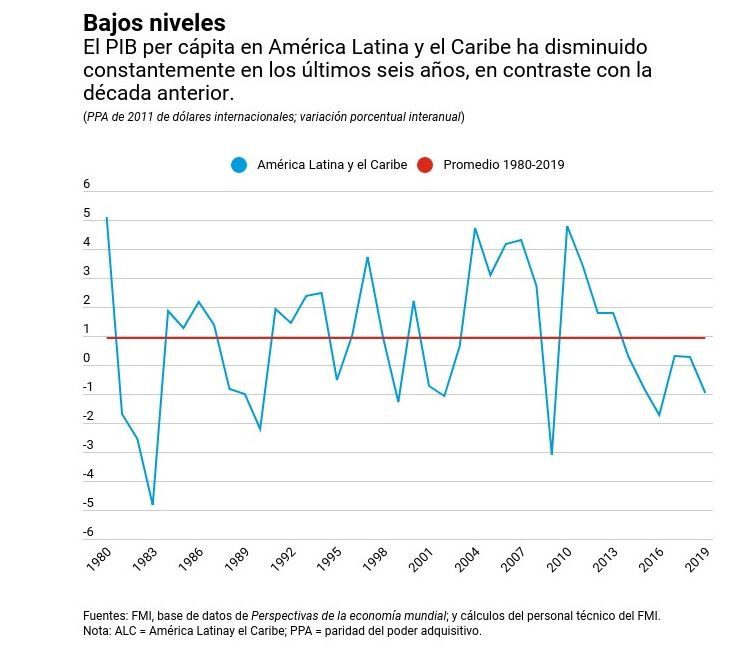 La economía de América Latina y del Caribe cierra 2019 con un magro crecimiento del 0,1%, y las cifras del período que comienza a partir del 2014 reflejan en conjunto la peor actuación de la región en las últimas décadas.